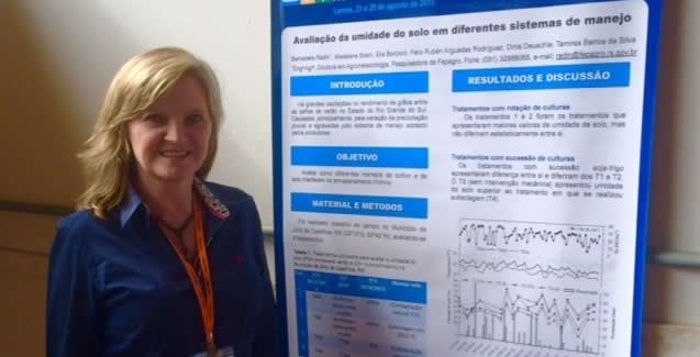 Segundo Bernadete, o objetivo do trabalho “Avaliação da umidade do solo em diferentes sistemas de manejo” foi avaliar como diferentes manejos de cultivo e de solo interferem no armazenamento hídrico. A instalação do experimento foi no município de Júlio de Castilhos em 2013, com soja, trigo, milho, ervilhaca, aveia-preta e nabo. “Fizemos avaliações de umidade entre dezembro de 2014 e fevereiro de 2015”, explicou.