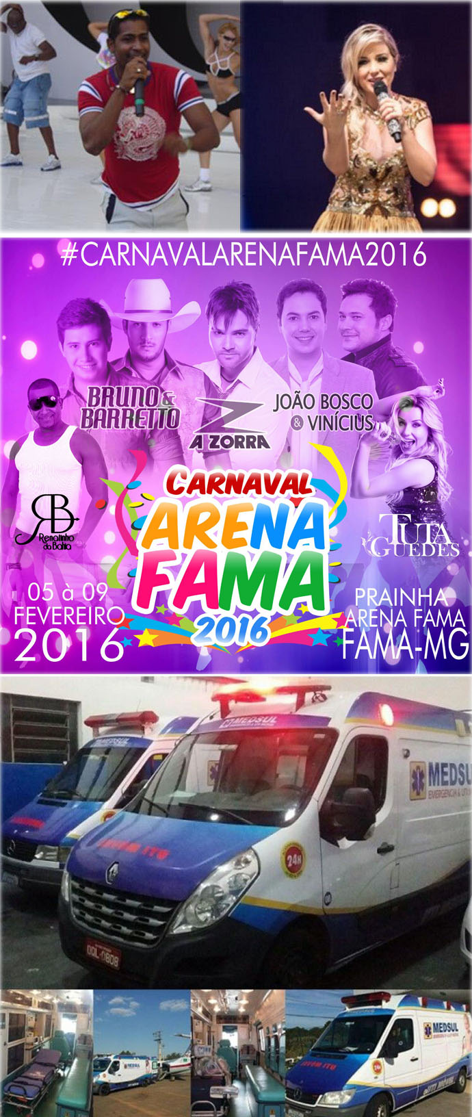 Acima, Renatinho da Bahia e Tuta Guedes que completam a programação do Carnaval Arena Fama. Abaixo, a ambulância que estará disponível durante o evento (Fotos: Reprodução e Divulgação)