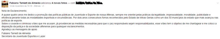 Na própria página, o secretário posta um link com uma nota de esclarecimento (veja logo abaixo) e os administradores da página respondem afirmando que não são “covardes” e acusa Tamiett de cometer crime. Em seguida, cita os artigos 41-A e o § 3º do art. 73 da Lei Eleitoral n˚ 9.840/99.