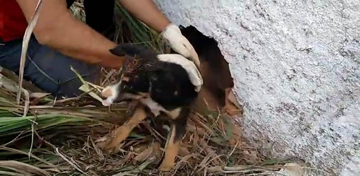 Bombeiros resgatam cão que ficou prensado entre paredes