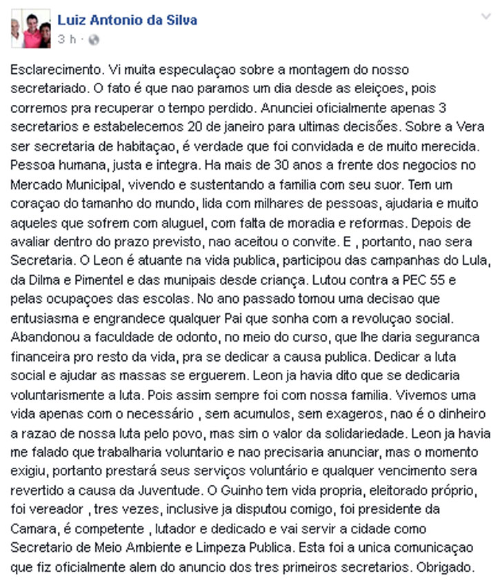 Após divulgar que o dia estabelecido para as últimas decisões sobre o secretariado está marcado para 20 de janeiro, o prefeito confirmou o convite feito a sua irmã e justificou a ação descrevendo-a como uma pessoa humana, justa e integra. “Há mais de 30 anos ela está à frente dos negócios no Mercado Municipal, vivendo e sustentando a família com seu suor. Tem um coração do tamanho do mundo, lida com milhares de pessoas, ajudaria e muito aqueles que sofrem com aluguel, com falta de moradia e reformas.”, argumentou. O prefeito também anunciou que sua irmã avaliou a proposta dentro do prazo previsto e acabou não aceitando o convite. “Portanto, ela não será secretária.”, enfatizou Luizinho.