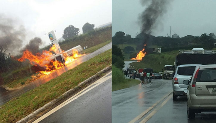 Um carreta tombou na BR-491, no final da manhã desta sexta-feira, e ficou em chamas.