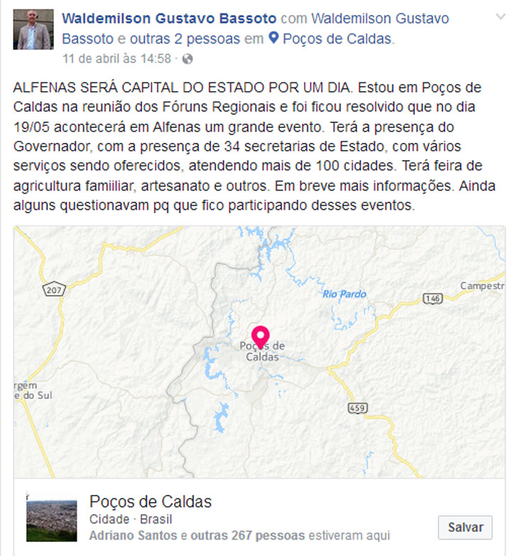 A data já está marcada: 19 de maio. Mas o local e o horário do evento ainda não foram anunciados. “Alfenas será capital do Estado por um dia. Estou em Poços de Caldas na reunião dos Fóruns Regionais e ficou resolvido que no dia 19/05 acontecerá em Alfenas um grande evento”, postou Padre Waldemilson nas redes sociais.