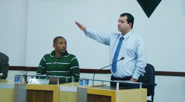 Observado por Reginaldo Flausino (PHS), Carlos Miguel faz o juramento durante a posse (Foto: Alessandro Emergente)