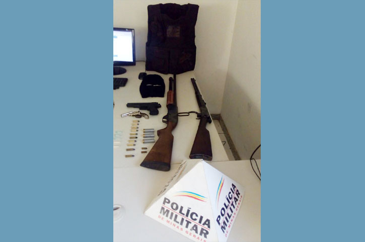 A PM apreendeu diversas armas com munições, além de um colete a prova de balas, uma toca ninja e uma pistola falsa.