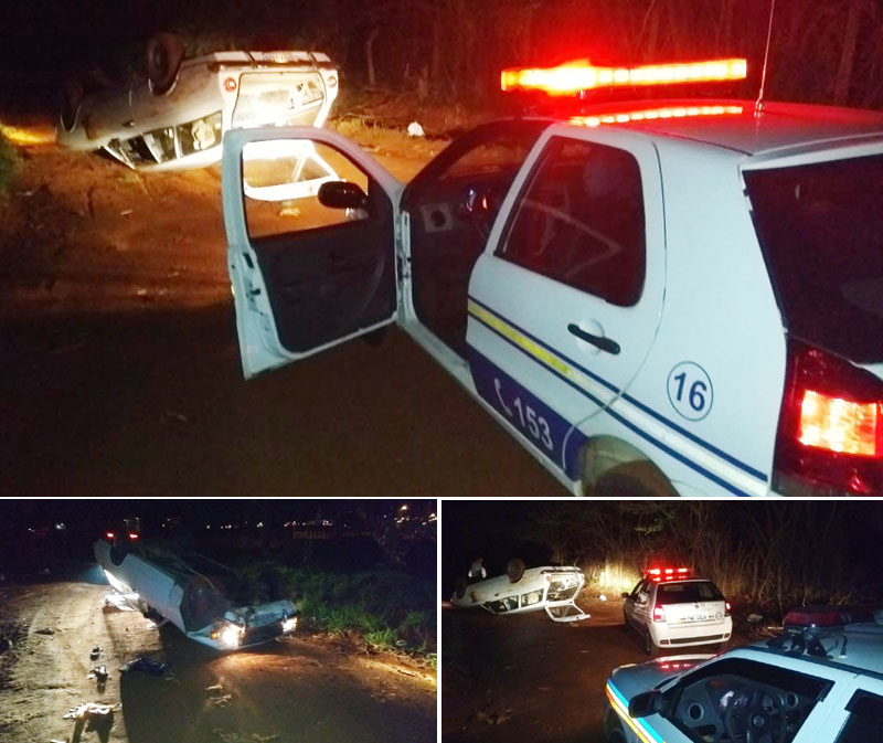 Um veículo, que havia sido furtado, acabou capotando durante uma fuga registrada durante a madrugada de segunda-feira. O capotamento foi durante uma perseguição policial. Os ladrões conseguiram fugir.