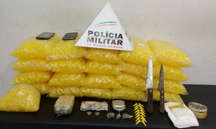 Na calçada da referida esquina foi localizado um aparelho celular sem procedência e, ainda em continuidade às buscas, foi encontrado no forro de uma casa desabitada, na Rua Barroso, um saco preto com 20 pacotes e meio de pinos vazios, com aproximadamente 20 mil unidades. Também foram apreendidos uma sacola contendo material para embalar drogas, uma balança de precisão e um tablete de maconha pesando aproximadamente 275 gramas.