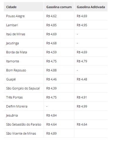 Segundo levantamento feito pela EPTV Sul de Minas, afiliada Rede Globo, com a colaboração de telespectadores, o preço do combustível varia de R$ 4,39 a R$ 4,99 em 14 cidades da região. Para se ter uma ideia, esse valor só é menor que o preço médio de capitais como Rio Branco (AC), R$ 4,771; Rio de Janeiro, R$ 4,533 e Goiânia, R$ 4,472. Já São Luís (MA) tem o menor valor médio, R$ 3,597.