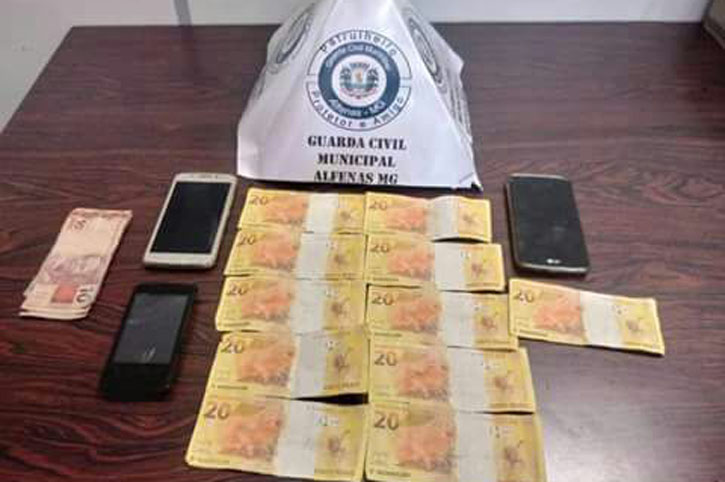 O guardas municipais localizaram os suspeitos e, durante a abordagem, encontraram 11 notas de R$ 20, todas com a mesma numeração de série. Essas notas estavam com Bruno de Souza, 18 anos, que também carregava três aparelhos celulares e R$ 31 em dinheiro.