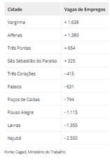Entre as cidades, destaque para Pouso Alegre, Alfenas e Varginha, que entre as 10 maiores, foram as que mais contrataram no ano passado.