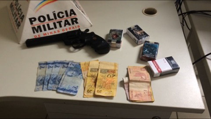 Ao ser percebido pelos PMs, o suspeito Ricardo Camilo Silva, 21 anos, pulou do telhado, saiu correndo em direção a uma área verde. Mas o rapaz foi capturado pelos policiais e, com ele, foram encontrados R$ 90,00 e quatro maços de cigarros. Próximo ao local, onde o suspeito foi preso, os PMs encontraram um simulacro de arma de fogo, que teria sido utilizado no roubo.