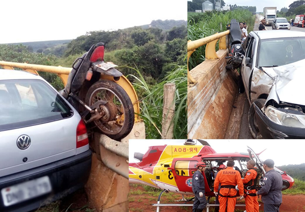 Carro roda, atinge moto e motociclista é lançado para fora da ponte