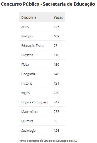 As disciplinas com vagas disponíveis são Artes, Biologia, Educação Física, Filosofia, Física, Geografia, História, Inglês, Língua Portuguesa, Matemática, Química e Sociologia.