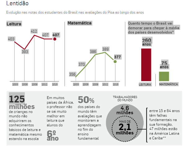 Um relatório inédito do Banco Mundial estima que o Brasil vá demorar 260 anos para atingir o nível educacional de países desenvolvidos em Leitura e 75 anos em Matemática. Isso porque o País tem avançado, mas a passos muito lentos. O cálculo foi feito com base no desempenho dos estudantes brasileiros em todas as edições do Pisa, a avaliação internacional aplicada pela Organização para a Cooperação e Desenvolvimento (OCDE).