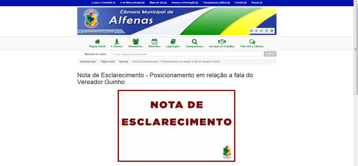 O presidente da Câmara Municipal de Alfenas e seus demais Vereadores, com exceção do Vereador Vagner Tarcísio de Morais (Guinho), esclarecem que não compactuam com os argumentos expostos por este Vereador em Reunião Ordinária no dia 14 de maio. Inclusive, durante a reunião alguns vereadores já haviam manifestado apoio à PM.