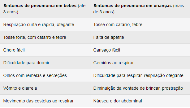 Estes sinais podem surgir repentinamente, no caso de pneumonia bacteriana ou ir se instalando aos poucos, como no caso da pneumonia viral, sendo importante informar o médico pediatra para diagnosticar o tipo de pneumonia e iniciar o tratamento adequado.