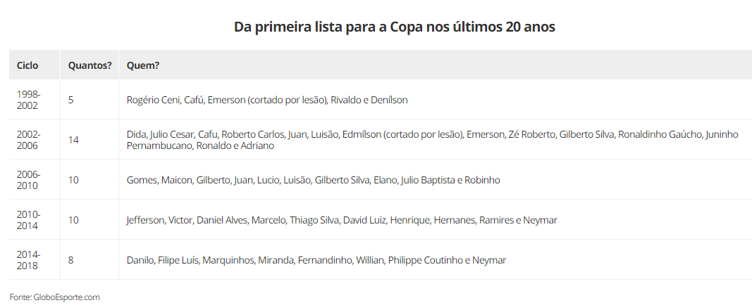 Em 2006 e 2010, dez atletas lembrados nas primeiras listas por Dunga e Mano Menezes foram convocados quatro anos mais tarde. No último ciclo, Tite levou para a Rússia oito jogadores que fizeram parte da primeira lista de Dunga em 2014.