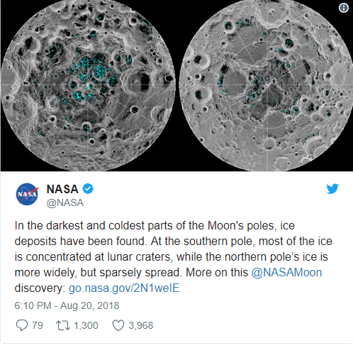 "Nas partes mais escuras e frias dos polos da Lua, depósitos de gelo foram encontrados. No polo sul, a maior parte do gelo está concentrada nas crateras lunares, enquanto no polo norte o gelo é mais vasto, e mais espalhado", escreveu a Nasa em anúncio no Twitter.
