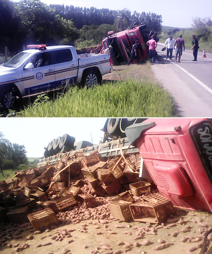 Um caminhão, carregado com uma carga de bata doce, tombou na última sexta-feira em um trecho da rodovia BR-369, no bairro Gaspar Lopes. Ninguém se feriu.
