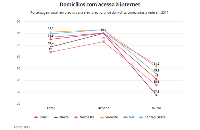- a área rural do país foi a que mais registrou expansão no número de domicílios conectados, que chegaram a 41%; nas áreas urbanas subiu para 80%;