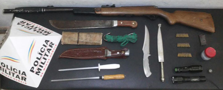 Um rifle, calibre 22, foi apreendido junto com vários outros objetos que seriam utilizados na caça.
