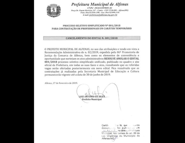 A Prefeitura de Alfenas publicou um decreto anulando um edital de 2018 para a contratação temporária. O processo simplificado (n° 01/2018) foi anulado por um decreto no último dia 27 e divulgado na segunda-feira (11) pelo governo.