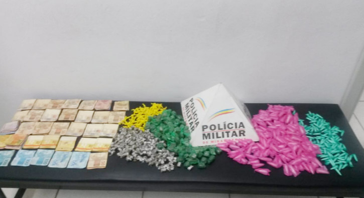 Uma grande quantidade de drogas foi apreendida na madrugada de terça-feira, no bairro Santa Luzia, pela Polícia Militar. Um suspeito de 24 anos foi preso no local da ocorrência, na rua Barão de Alfenas, em uma área conhecida como região dominada pelo tráfico de drogas.