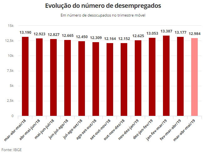 Segundo o IBGE, o número de desempregados "ficou estatisticamente estável" tanto em relação a igual período de 2018 como frente ao trimestre anterior (de dezembro de 2018 a fevereiro de 2019). É a primeira vez desde o trimestre finalizado em janeiro (12,625 milhões), entretanto, que o contingente vai abaixo dos 13 milhões.