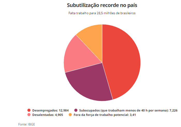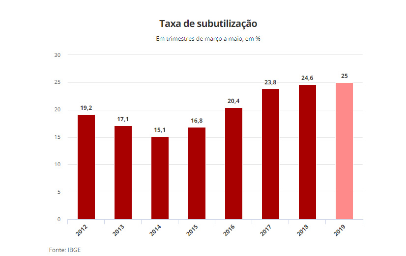 A taxa composta de subutilização da força de trabalho subiu para 25% ante 24,6% no trimestre anterior, se situando em patamar recorde. O número significa que 1 em cada 4 brasileiros em condições de trabalhar está desempregado, trabalhando menos horas do que gostaria ou simplesmente desistiu de procurar emprego.