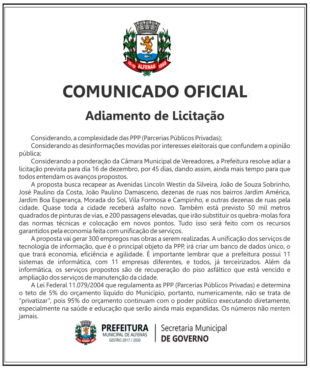 Confira abaixo uma nota divulgada pela Prefeitura de Alfenas ao comunicar o adiamento da licitação.