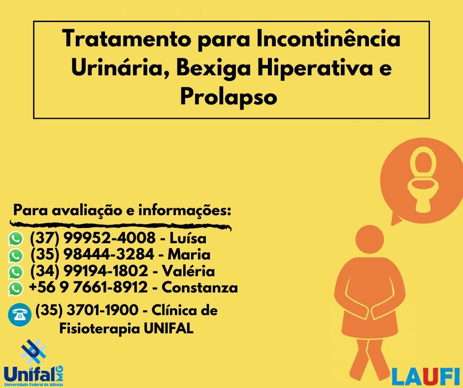 Pacientes com incontinência urinária, prolapso (bexiga caída) e bexiga hiperativa (urgência para urinar) estão sendo recrutados pelo Laboratório de UroFisioterapia da Unifal (Universidade Federal de Alfenas).