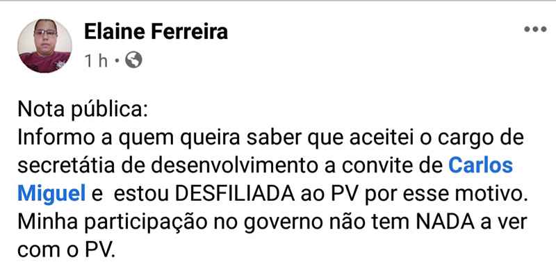 Na noite de segunda-feira, Elaine publicou em seu perfil, nas redes sociais, que sua filiação não passou pelo crivo do PV e que foi uma indicação do ex-secretário, informação confirmada por Carlos Miguel nos comentários do post. O comunicado foi no mesmo dia em que a direção do PV se reuniu para deliberar sobre o assunto.