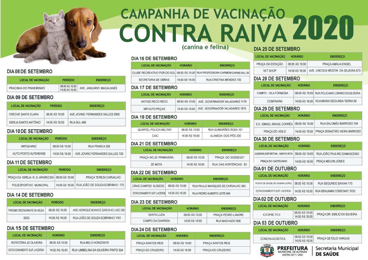 Teve início, na terça-feira (8 de setembro), a campanha de vacinação contra a raiva. A vacinação gratuita em Alfenas vai até 6 de outubro, sendo o dia 3 de outubro o último dia na área urbana, na Concha Acústica (Praça Getúlio Vargas). Confira a programação ao final da reportagem.
