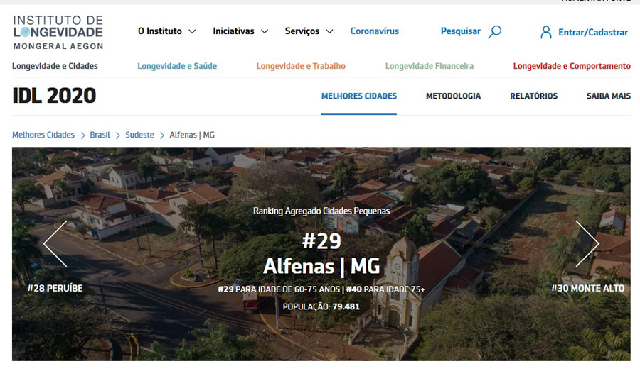 Alfenas aparece na 29ª colocação em um ranking nacional que aponta as melhores cidades do país para os idosos. O Índice de Desenvolvimento Urbano para Logenvidade (IDL) foi publicado pelo Instituto de Logenvidade Mongeral e é a segunda edição do estudo. A cidade manteve-se na mesma posição alcançada na edição anterior, publicada em 2017.
