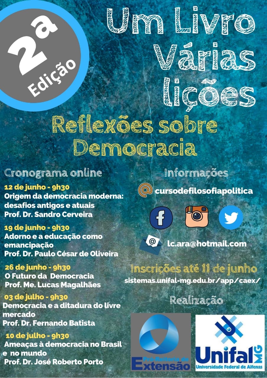 A Unifal (Universidade Federal de Alfenas) vai ofertar mais uma edição do projeto “Um Livro, Várias Lições” com cinco aulas realizadas de forma remota. Desta vez o curso terá como tema central a Democracia vista pela ótica de autores clássicos da filosofia, história e economia. As inscrições vão até o dia 11 de junho e estão abertas para todas as pessoas interessadas.