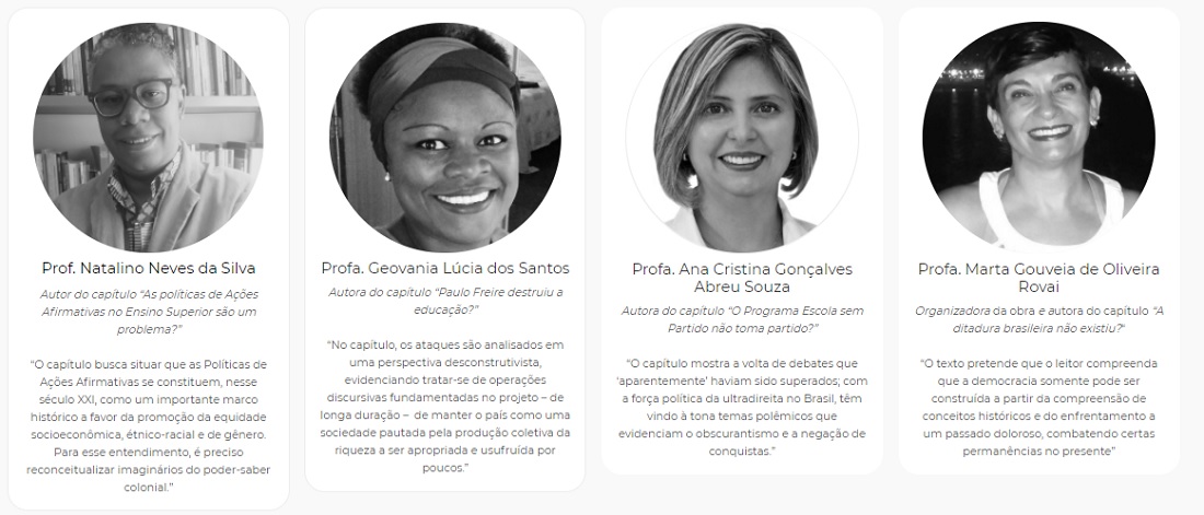 Para cumprir a proposta, o livro trata de temas fundamentais sobre a história, a educação, a arte e a diversidade brasileira, que têm hoje tomado conta das redes virtuais e de debates muitas vezes acalorados, mas desprovidos de conhecimentos científicos. Além de ser prefaciado pelo professor Fernando Nicolazzi, da Universidade Federal do Rio Grande do Sul (UFRGS), o livro conta com a contribuição dos pesquisadores:
