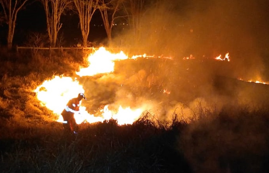 O Corpo de Bombeiros de Alfenas permaneceu durante boa parte da madrugada de domingo (15) combatendo um incêndio em uma área verde. O fogo se espalhou por uma área de pastagem no bairro Colinas Park.