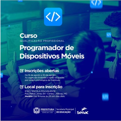 A Secretaria Municipal de Educação, em parceria com o Senac (Serviço Nacional de Aprendizagem Comercial), está com as inscrições abertas para o curso de qualificação profissional programador de dispositivos móveis desde o último dia 16.