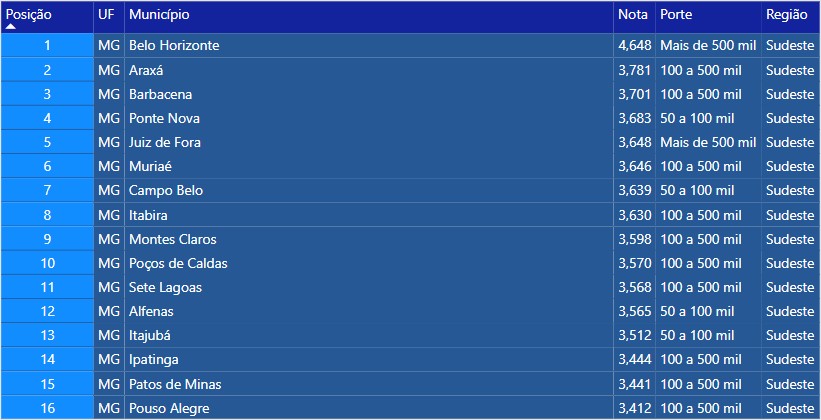No ranking em que considera todas as cidades pesquisadas Alfenas está na 12ª colocação, atrás de Belo Horizonte, Araxá, Barbacena, Ponte Nova, Juiz de Fora, Muriaé, Campo Belo, Itabira, Montes Claros, Poços de Caldas e Sete Lagoas.
