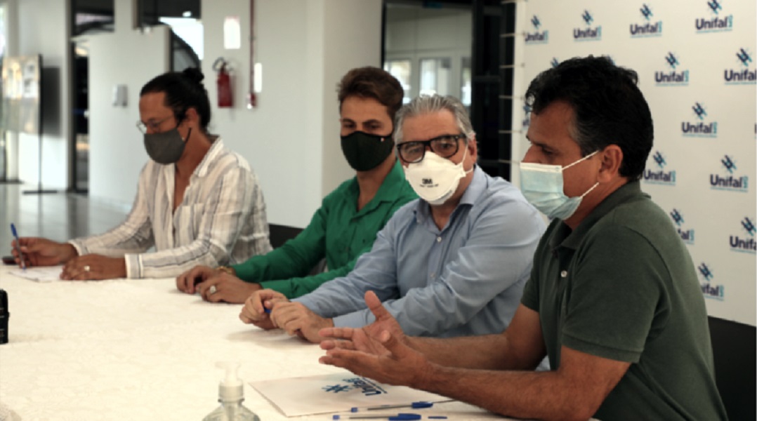 A Unifal (Universidade Federal de Alfenas e a Prefeitura de Alfenas oficializaram, por meio de um termo de cooperação, a parceria no desenvolvimento de ações de sustentabilidade em Alfenas. A assinatura do termo de cooperação ocorreu na última terça-feira (16), no campus sede da Universidade, com a presença do reitor Sandro Amadeu Cerveira, do prefeito Luiz Antônio da Silva (Luizinho/PT), do vereador Luciano Solar (Luciano Lee/PV), do secretário municipal Fabrício Casarejos (Clima, Sustentabilidade e Inovação Social) e da gerente de meio ambiente e desenvolvimento sustentável da Unifal, Julieta Moreira Rodrigues.