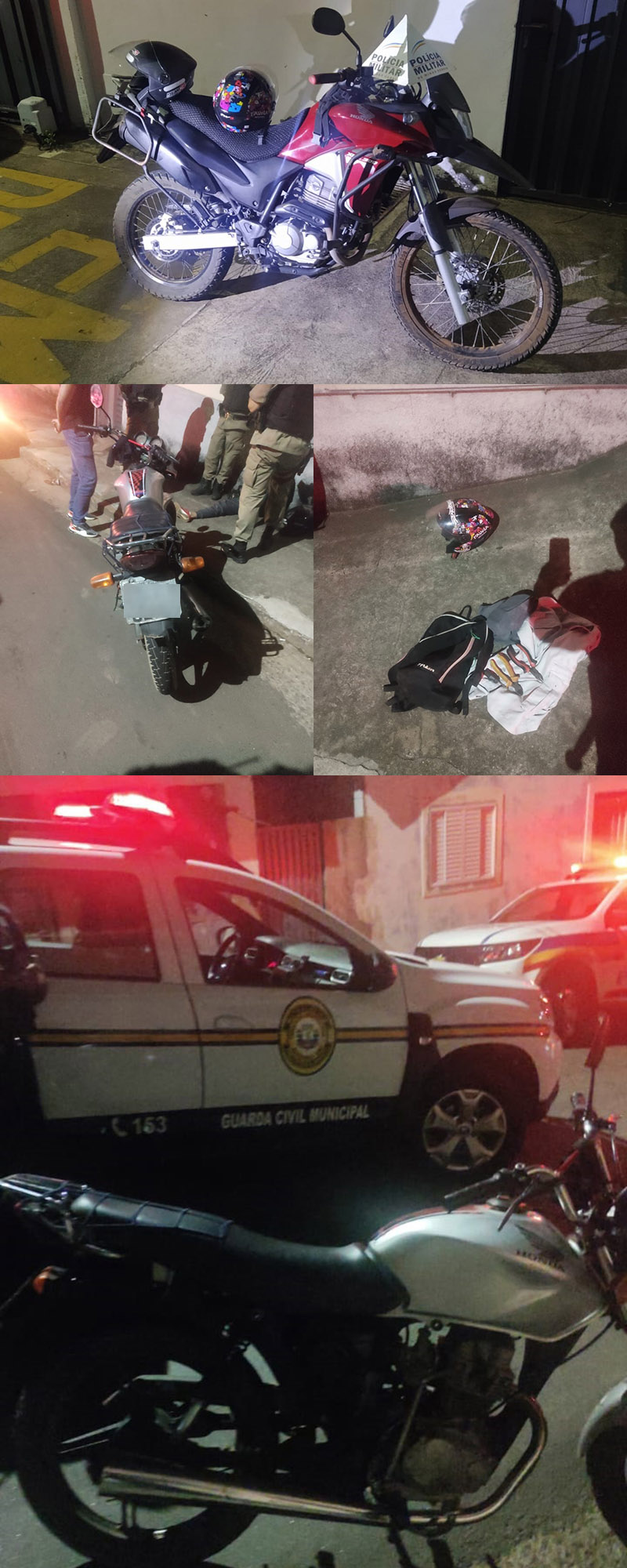 A motocicleta foi furtada no Jardim Tropical no decorrer da tarde, porém as características dos suspeitos foram levantadas em uma investigação conjunta feita pela PM e pela GCM. Com as informações apuradas, os agentes de segurança realizaram um trabalho de rastreamento dos envolvidos, que utilizaram uma segunda motocicleta para dar apoio a ação criminosa.