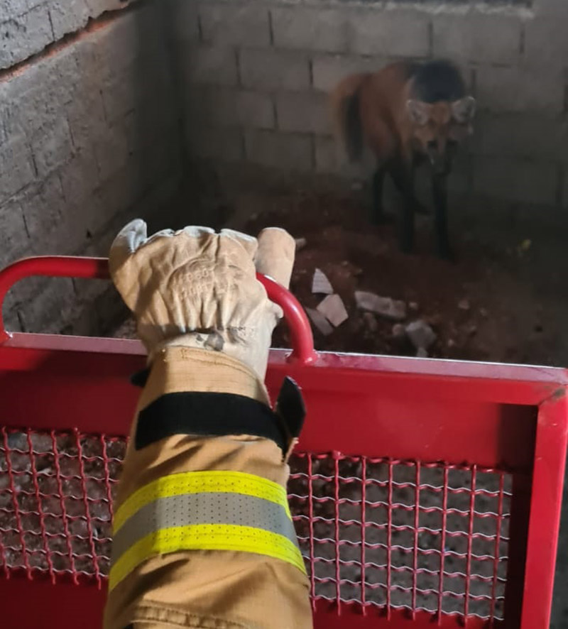 Os bombeiros inicialmente tiveram que conter o lobo-guará de forma segura para não ocasionar nenhum ferimento ao animal, que estava assustado e agressivo. Foi necessário uso de equipamentos de contenção de captura de animal silvestre.