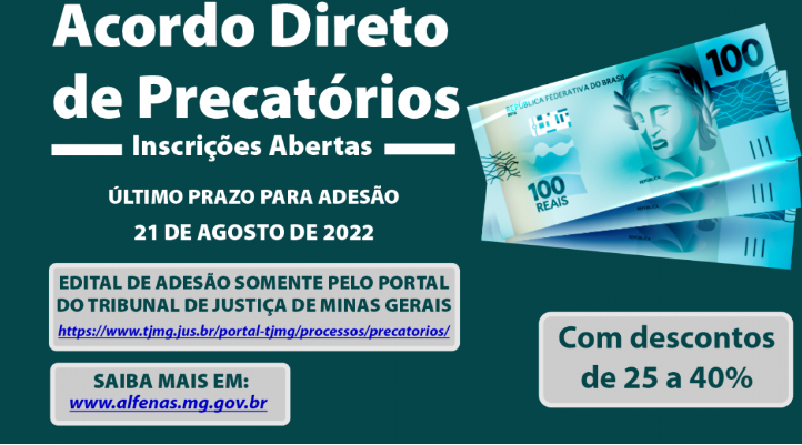 Os interessados devem ficar atentos quanto ao prazo para adesão de acordos diretos em precatórios devidos pelo Município e já podem se habilitar de acordo com o edital nº 01/2022, divulgado pelo Tribunal de Justiça de Minas Gerais (TJ) em seu portal on-line. A medida foi autorizada através do Decreto nº 2.770, de 09 de dezembro de 2020, e possibilita que credores saiam da fila de espera judiciária e antecipem o recebimento de valores.