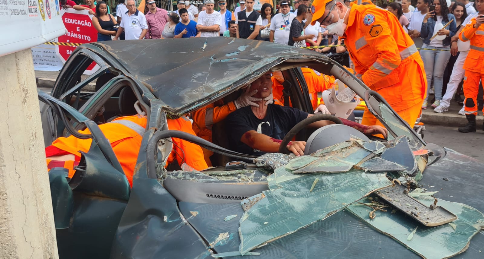 Através de uma “falsa vítima”, dentro do automóvel, foi feito pela equipe de salvamento o corte da lataria do veículo, após retirada dos materiais e liberação da suposta vítima presa nas ferragens, a equipe de resgate realizou os procedimentos de “APH”, que são os primeiros socorros. Em seguida, dentro da unidade de resgate, foi simulado o encaminhamento da vítima para o hospital. Abaixo, foto divulgada pelo Corpo de Bombeiros.