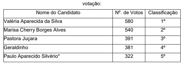 Paulo Aparecido Silvério foi reeleito conselheiro com 322 votos, a mesma votação de Débora do Gélia Lanches, que ficou como suplente. O critério de desempate estava previsto no edital, que determina que seja considerado vencedor o candidato que possuir maior período de exercícios de atividade no trato com criança e adolescente. Confira os eleitos: