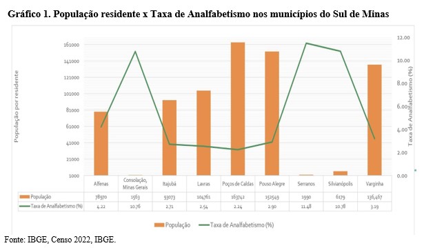 No entanto, é importante ressaltar que, apesar de mais de 75% da região ser composta por municípios com menos de 20 mil habitantes, a taxa de analfabetismo registrada para as cidades do Sul de Minas é de 6,57%, ligeiramente maior que a taxa do estado de Minas Gerais (5,85%), porém ainda abaixo da média nacional (7%). Apesar de haver desigualdade entre os municípios, no que se refere aos recursos disponibilizados para investir em educação, a região se mantém firme aos superar os obstáculos na luta pela alfabetização, conseguindo oferecer esse nível básico de educação para sua população.