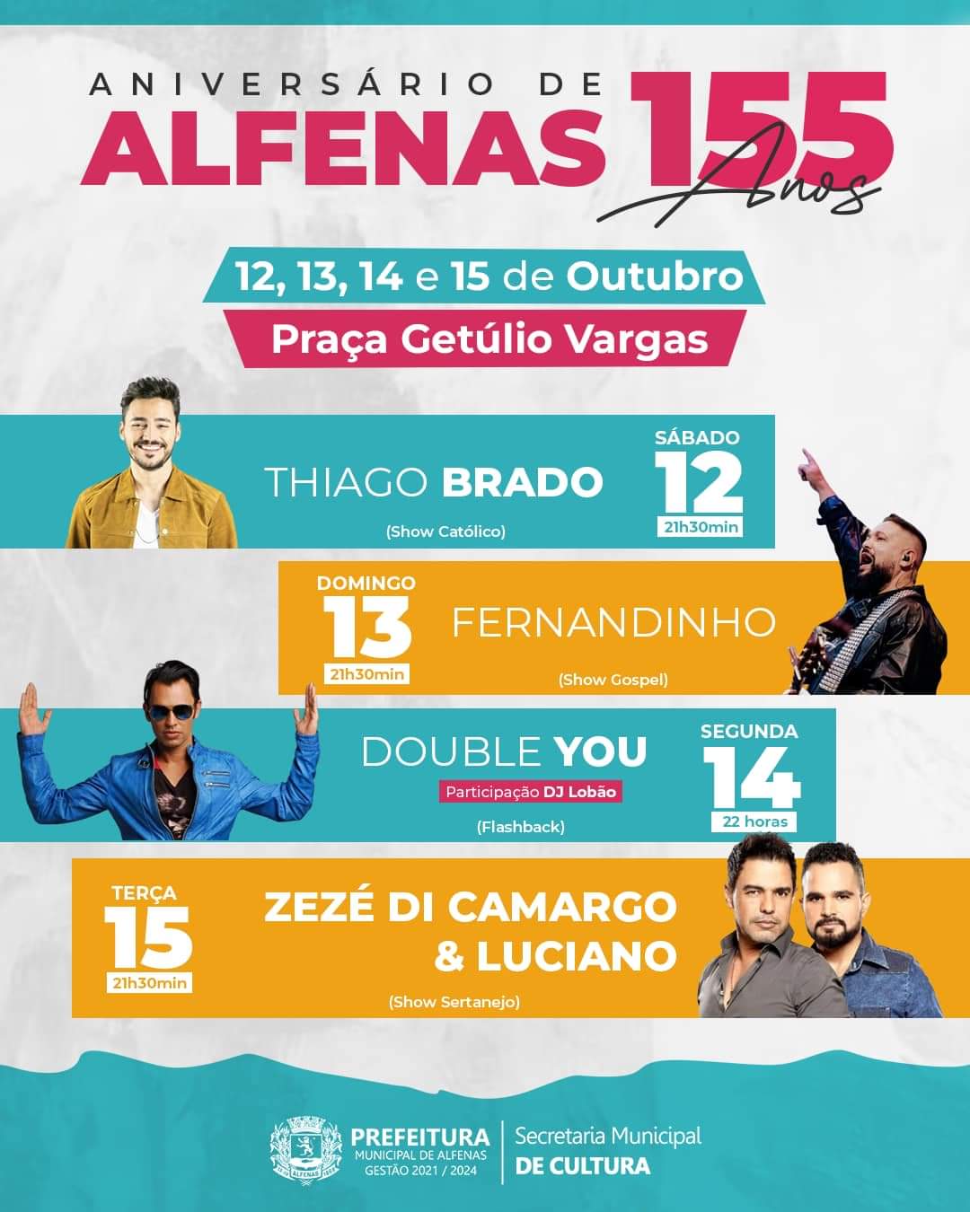 A Prefeitura de Alfenas anunciou a programação do aniversário dos 155 anos da cidade. A principal atração será o show de Zezé di Camargo e Luciano, agendado para 15 de outubro.