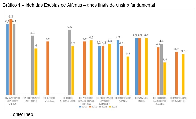 Entre as escolas públicas de Alfenas houve uma queda significativa no Ideb dos anos finais do ensino fundamental (6º ao 9º ano), entre 2019 e 2023. As escolas estaduais de Alfenas foram duramente afetadas, com três delas sendo encontradas entre as dez piores da região sul de Minas Gerais. Os dados foram analisados pelo projeto de extensão “A Imaginação Sociológica e o Sul de Minas”, do curso de Ciências Sociais da Unifal (Universidade Federal de Alfenas).