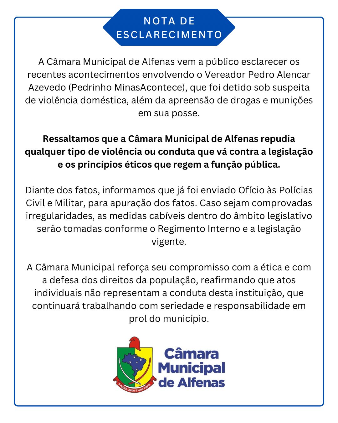 Na nota, o Legislativo disse que enviou à Polícia Civil e a Polícia Militar ofícios para apuração do caso e, se comprovada irregularidades, medidas com base no Regimento Interno serão adotadas. "A Câmara Municipal de Alfenas repudia qualquer tipo de violência ou conduta que vá contra a legislação e os princípios éticos que regem a função pública", diz a nota.