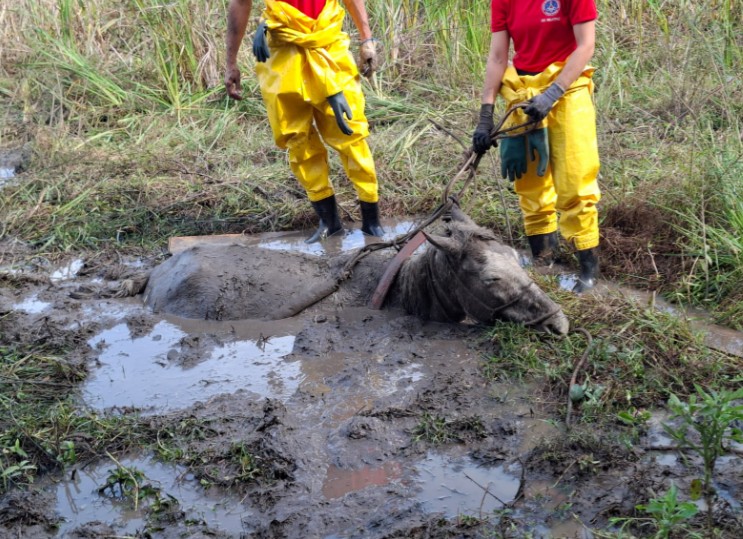 Cavalo é resgatado pelo Corpo de Bombeiros após atolar em buraco